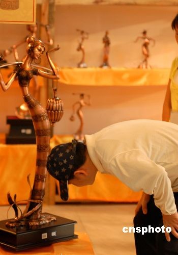 云南民族民間工藝品交易市場(chǎng)6月10日在昆明開(kāi)業(yè),該市場(chǎng)占地10000平方米,是中國(guó)少有的民族民間工藝品專業(yè)交易場(chǎng)所。云南省將借助該市場(chǎng)推出木雕、青銅器、錫器等具有競(jìng)爭(zhēng)力的民族民間工藝品,做大民族文化產(chǎn)業(yè)。開(kāi)業(yè)僅兩天,該市場(chǎng)已成為云南各大旅行社帶團(tuán)參觀的必經(jīng)之地。圖為6月13日,一名游客被一尊名為汲水歸來(lái)的銅像吸引,該銅像獨(dú)具傣家風(fēng)情,叫價(jià)近萬(wàn)元。中新社發(fā) 保旭 攝