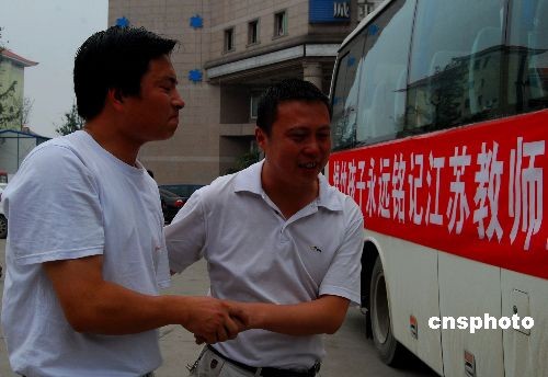 6月16日中午,綿竹地震災(zāi)區(qū)最后一批52名江蘇幫扶支教老師圓滿完成為期131天的支教任務(wù),離開(kāi)綿竹踏上歸途。綿竹社會(huì)各界群眾和學(xué)生組成的軍樂(lè)隊(duì)前來(lái)為他們送行。據(jù)悉,地震后,江蘇省先后派遣了110名中小學(xué)骨干教師前往綿竹災(zāi)區(qū)各中小學(xué)擔(dān)負(fù)支教任務(wù)。中新社發(fā) 胥輝 攝