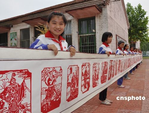 6月17日,在山東博興縣興福鎮(zhèn)村魏小學(xué),歷經(jīng)近兩個月的時間,由該校刻紙興趣小組小學(xué)生集體制作的刻紙作品《水滸一百單八將》全部刻制完成。這幅作品全長38米,寬0.6米,容納進了宋江、林沖、魯智深等梁山好漢108人刻紙像。作品以剪紙與刀工技藝結(jié)合手法,形象表現(xiàn)了我國古代四大名著《水滸傳》中108位“梁山好漢”的個性。中新社發(fā) 陳彬 攝