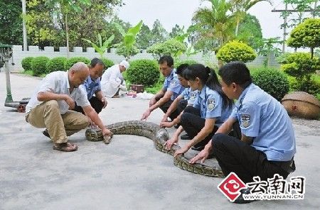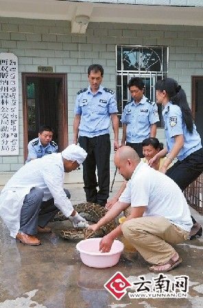 幫巨蟒清洗完身體后,民警當(dāng)場為其體檢:身長3.7米,腹圍粗為55厘米,重達(dá)25公斤。經(jīng)西雙版納傣族自治州林業(yè)局野生動物保護(hù)站獸醫(yī)師許定澤鑒定,這條巨蟒屬于國家一級保護(hù)野生動物的雌性金花蟒,年齡約20歲左右。根據(jù)蟒蛇約35歲左右的壽命推算,其應(yīng)該正處于盛年期。據(jù)許定澤介紹,這樣大的金花蟒,實(shí)屬罕見。(戴振華 常宗波)