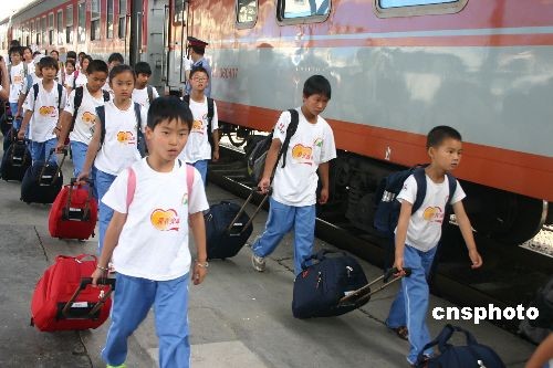 6月20日16時25分,由鐵道部特批的“日照-成都”愛心專列安全駛?cè)氤啥寄险尽?22名在山東日照“安康家園”學習生活的地震災區(qū)孩子,在離開四川家鄉(xiāng)一年后,重新踏上家鄉(xiāng)的土地,即將開啟他們新的生活。去年6月,在全國婦聯(lián)、中國兒童少年基金會的安排下,來自四川省10個市、州的共720名災區(qū)娃娃,分22批陸續(xù)安排到山東日照市生活、學習。其中有522四川地震災區(qū)的娃娃(其中338名地震孤兒)前往山東日照市“安康家園”學習生活,日照鋼鐵集團拿出192套新建職工住房建起“日照安康家園”,配備了120多位專職“安康媽媽”,同時建起食堂、醫(yī)務室、電子閱覽室等,創(chuàng)造了全國災區(qū)娃娃安置中最大的“家”。中新社發(fā) 霍潺 攝