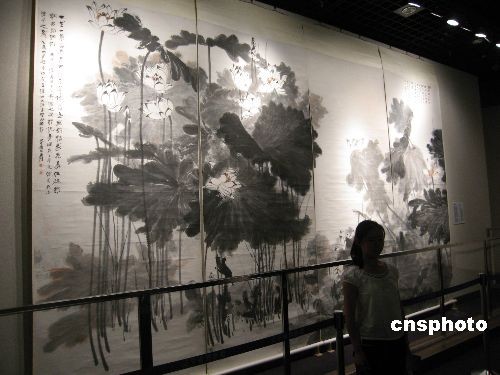 7月3日至8月3日,由遼寧省博物館、臺(tái)北歷史博物館、中華海峽兩岸文化資產(chǎn)交流促進(jìn)會(huì)共同主辦的《南張北溥——臺(tái)北歷史博物館藏張大千、溥心畬書(shū)畫(huà)作品展》,在遼寧省博物館舉辦。展品中張大千的《大墨荷通屏》畫(huà)長(zhǎng)6米、高3.58米,可稱(chēng)得上是巨作,很多參觀者被其所吸引。圖為7月7日,人們紛紛在畫(huà)作前拍照留念。中新社發(fā) 沈殿成 攝
