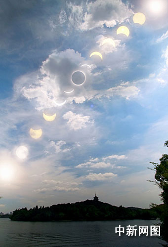 中新網(wǎng)杭州7月22日電(記者 張兆嶺)二十二日早八時(shí)二十二分左右,世人矚目五百年一遇的日全食在浙江省杭州市上空出現(xiàn)初虧,由于當(dāng)?shù)囟嘣,眾多市民和游客在著名景點(diǎn)西湖邊露眼觀測,忽隱忽現(xiàn)的太陽隨云層涌動(dòng),似穿越時(shí)空,給這個(gè)天象奇觀更添幾分神秘;九時(shí)三十四分,日甚,全城進(jìn)入夜間模式,驚呼聲、感嘆聲、喝彩聲……讓西湖進(jìn)入一次白天的夜間狂歡。至十點(diǎn)五十五分太陽整體重放光芒,眾多觀者依然不愿離去。