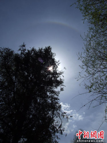 中新網(wǎng)5月23日電 (高峰毅 焦瑾琦) 近日,華北地區(qū)氣溫居高不下。5月21日晚9時(shí)許,山西五臺(tái)山出現(xiàn)了月暈現(xiàn)象,持續(xù)了近一個(gè)小時(shí)。而第二天,即22日上午9時(shí)許,五臺(tái)山上空又出現(xiàn)了日暈奇觀,,并持續(xù)了兩個(gè)多小時(shí)。這兩種暈的出現(xiàn)時(shí)間差不足12小時(shí),著實(shí)令人稱(chēng)奇。
