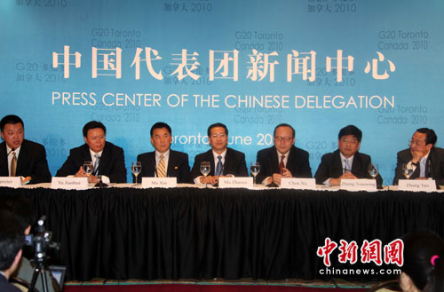 當(dāng)?shù)貢r(shí)間6月26日下午,中國代表團(tuán)新聞中心在加拿大多倫多舉行中外記者會(huì)。擔(dān)任中國代表團(tuán)發(fā)言人的外交部新聞司司長(zhǎng)馬朝旭宣布,27日上午,在G20峰會(huì)開始后,胡錦濤主席將發(fā)表主旨講話。