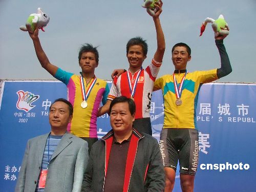 十月二十日上午,第六屆全國城市運動會自行車男子公路決賽在河南洛陽新區(qū)體育中心舉行,經(jīng)過激烈的爭奪,河南平頂山市小伙仇光遠(yuǎn)摘得貴冠,昆明的陳武、銀川的征學(xué)東分別獲得第二、第三名。 圖為獲獎選手與頒獎人員合影留念。中新社發(fā) 史寶銀 攝