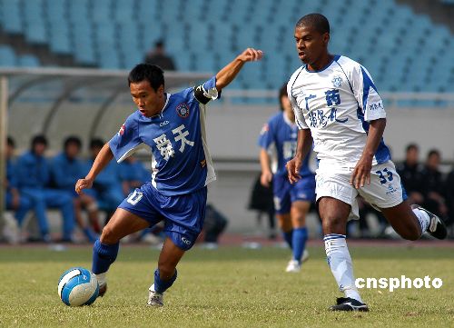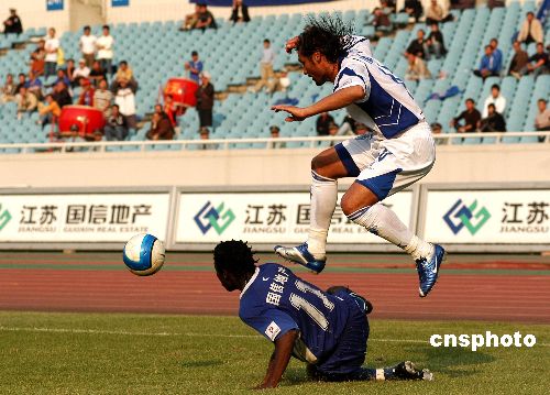 2007年10月20日下午,中甲聯(lián)賽第25輪的比賽打響。在南京奧體中心體育場進(jìn)行的一場比賽中,主場作戰(zhàn)的江蘇隊(duì)以1比0戰(zhàn)勝廣州隊(duì)。中新社發(fā) 劉建民 攝
