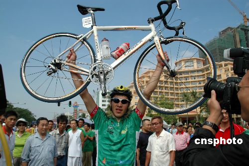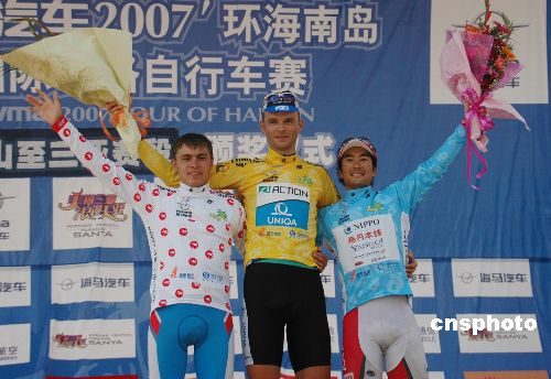 十一月十日,“海馬汽車”二00七環(huán)海南島國際公路自行車賽結(jié)束了所有的比賽,波蘭隊車手羅伯特·仁多士以二十六小時四十分四十八秒的總成績獲得個人總成績冠軍,他還獲得了第七賽段五指山至三亞分賽段冠軍和沖刺王。日本隊車手岡崎和也以二十六小時四十一分二十一秒的成績獲得亞洲最佳。俄羅斯隊車手米海勒·安德諾夫穿上了象征爬山王的圓點衫。波蘭隊還獲得了本屆賽事的團體冠軍,成為本屆比賽的最大贏家。中新社發(fā) 尹海明 攝