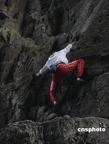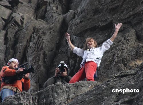 11月18日,法國(guó)“蜘蛛人”阿蘭·羅伯特經(jīng)過(guò)近1個(gè)小時(shí)的無(wú)保護(hù)徒手攀登,成功登上湖南張家界天門(mén)山天門(mén)洞左側(cè)高度約200米的巖壁,順利完成挑戰(zhàn)天門(mén)洞的計(jì)劃。中新社發(fā) 郭國(guó)權(quán) 攝