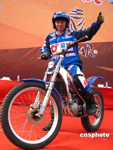 12月8日下午,中國(guó)首位摩托車手曹魯征戰(zhàn)2008年達(dá)喀爾拉力賽出征發(fā)車儀式在南京白馬公園舉行。今年30歲的曹魯曾先后獲得全國(guó)摩托車越野技巧賽冠軍、第二屆中國(guó)沙漠環(huán)塔拉力賽摩托車組總冠軍等榮譽(yù)。這次曹魯成為第一位摩托車手代表中國(guó)參加2008年1月5日發(fā)車的第30屆巴黎--達(dá)喀爾拉力賽,實(shí)現(xiàn)了他個(gè)人和中國(guó)摩托車界的夢(mèng)想。中新社發(fā) 谷昌旺 攝