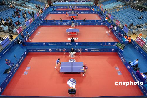 12月13日,新近落成的北京大學(xué)奧運(yùn)乒乓球館迎來“好運(yùn)北京”2007年ITTF職業(yè)巡回賽總決賽。奧運(yùn)乒乓球館可提供固定與活動座位共7557座,其中位于首層的比賽場地長47米,寬39.5米,最多可布置8張乒乓球臺同時進(jìn)行比賽。放入活動座椅后,賽場變?yōu)殚L27米,寬20米,可放置2張乒乓球臺進(jìn)行比賽。中新社發(fā) 吳芒子 攝