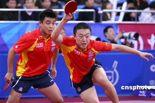 12月15日,2007年度國際乒聯(lián)職業(yè)巡回賽總決賽在北京大學(xué)體育館進(jìn)入第三個賽日的爭奪。在當(dāng)日下午進(jìn)行的一場男雙半決賽中,郝帥/馬龍和王皓/馬琳狹路相逢,經(jīng)過7局苦戰(zhàn),王皓(左)/馬琳(右)戰(zhàn)勝對手進(jìn)軍決賽。中新社發(fā) 富田 攝