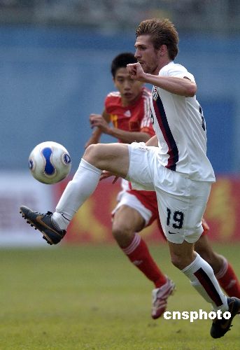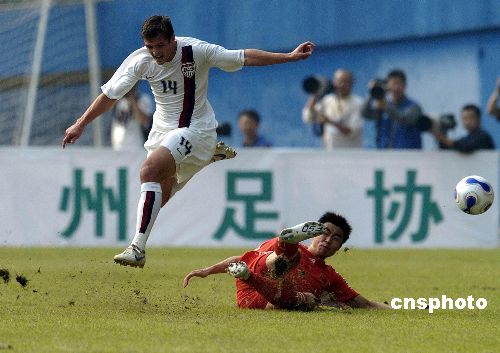 2007年12月16日下午,中國(guó)國(guó)奧隊(duì)與美國(guó)國(guó)奧隊(duì)的第二場(chǎng)友誼賽在廣州越秀山體育場(chǎng)鳴哨。在上半場(chǎng)比賽中,大幅調(diào)整陣容的中國(guó)國(guó)奧隊(duì)完全被對(duì)手壓制,美國(guó)隊(duì)由羅杰斯、蘭尼和達(dá)維斯各入一球,早早以3比0領(lǐng)先。國(guó)奧隊(duì)主帥杜伊在下半場(chǎng)頻繁換將,國(guó)奧小將們展開反撲,朱挺、杜震宇相繼送出精彩入球,最終比分為3比3。補(bǔ)時(shí)階段王曉龍不理智的犯規(guī)引發(fā)雙方?jīng)_突,其與克里斯坦雙雙被罰下。中新社發(fā) 吳峻 攝