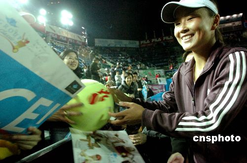 一月五日,彭帥在香港網(wǎng)球精英賽優(yōu)秀組女子決賽中以二比一戰(zhàn)勝沃茲尼亞基,奪得冠軍。圖為彭帥賽后為觀眾簽名。中新社發(fā) 鄧慶樂(lè) 攝