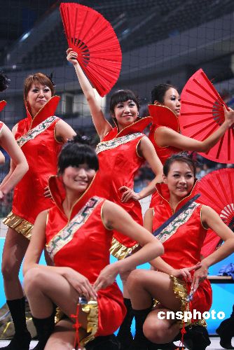 1月11日,“好運北京”2008手球邀請賽在國家體育館落幕。圖為啦啦隊隊員活力四射的勁舞,為比賽添色不少。中新社發(fā) 富田 攝