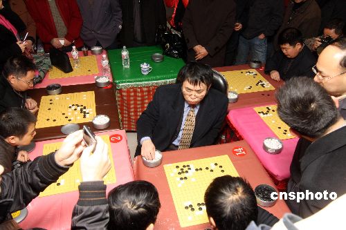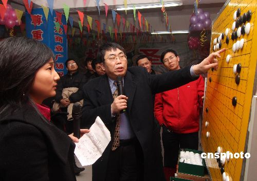 1月15日,聶衛(wèi)平在湖南漣源市與5位棋手展開(kāi)車(chē)輪大戰(zhàn)。當(dāng)日,聶衛(wèi)平與漣源市迎奧運(yùn)首屆“九龍杯圍棋大獎(jiǎng)賽”冠軍胡軍民、亞軍潘勇、劉小希等5位棋手展開(kāi)車(chē)輪大戰(zhàn)。聶衛(wèi)平分別讓給他們2-4個(gè)子,經(jīng)過(guò)2個(gè)多小時(shí)的決戰(zhàn),聶衛(wèi)平“輸”給胡軍民、潘勇、劉小希3人,贏取另2人。賽后聶衛(wèi)平為婁底市百多名棋手講解精彩圍棋。中新社發(fā) 郭國(guó)權(quán) 攝