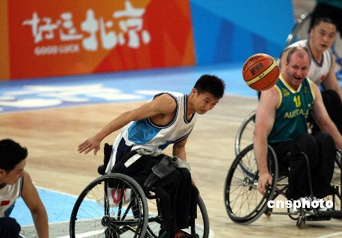 好運(yùn)北京-2008國際輪椅籃球邀請賽,1月20日在北京奧運(yùn)會主要賽場-國家體育館舉行。此次賽事的主旨是全面檢測北京殘奧會比賽的各個環(huán)節(jié),北京殘奧會的輪椅籃球賽事就在該體育館舉行。圖為世界勁旅澳大利亞隊(duì)(綠)與中國隊(duì)在男子比賽中。中新社發(fā) 任晨鳴 攝