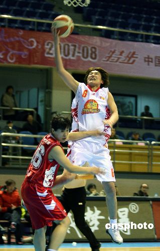 1月22日晚,2007—2008特步WCBA聯(lián)賽再戰(zhàn)一輪,北京金隅(白衣)坐陣主場對(duì)陣沈部新鑫隊(duì),以74:82不敵對(duì)手。中新社發(fā) 王韶驊 攝
