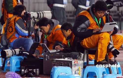 2月17日,2008東亞足球錦標(biāo)賽揭幕戰(zhàn)在中國重慶打響。揭幕戰(zhàn)中,中國隊(duì)未能打破“恐韓”魔咒,以2:3惜敗于韓國,日本則與朝鮮隊(duì)1:1戰(zhàn)平,中國隊(duì)排名暫時(shí)位居末位。圖為球賽中場休息時(shí),記者們?cè)趫鲞厾幏謯Z秒發(fā)稿。中新社發(fā) 郭晉嘉 攝
