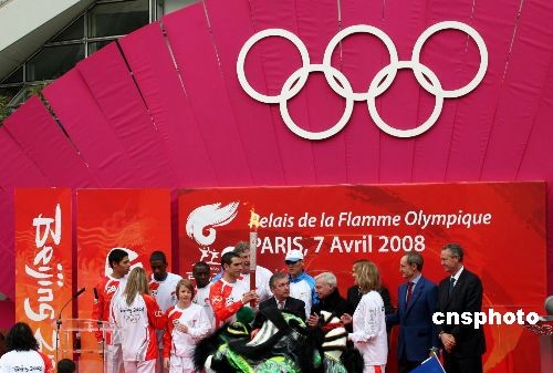 法國巴黎時間7日17時40分(北京時間23時40分),北京奧運會圣火傳遞到巴黎市夏洛蒂體育場,完成了在巴黎的傳遞。中新社發(fā) 吳衛(wèi)中 攝