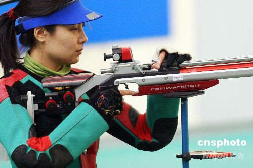 4月12日下午,“好運北京”2008國際射聯(lián)世界杯賽的首枚金牌在北京射擊館產(chǎn)生,中國名將杜麗在女子十米氣步槍決賽中,以總成績502.2環(huán)獲得銅牌。捷克25歲名將埃蒙斯(EMMONS Katerina)以總成績504.9環(huán)奪得該次比賽首金,并平了杜麗保持的此項目的世界紀錄。中新社發(fā) 富田 攝