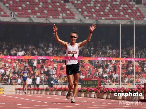 4月18日,國家體育場“鳥巢”迎來首場賽事,“好運北京”2008國際田聯(lián)競走挑戰(zhàn)賽在此打響。在男子20公里競走比賽中,澳大利亞選手塔倫特以1小時20分11秒的成績摘得了“鳥巢”建成以來的首枚金牌。中新社發(fā) 富田 攝