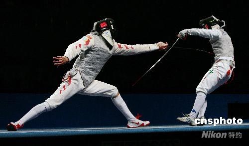 4月18日,“好運(yùn)北京”2008國際劍聯(lián)世界錦標(biāo)賽在國家會議中心擊劍館打響,首先進(jìn)行的是男子花劍團(tuán)體的比賽,在1/4決賽中,雅典奧運(yùn)會團(tuán)體金牌得主意大利隊(duì)(右)以45-33的比分戰(zhàn)勝了東道主中國隊(duì)(左),率先挺進(jìn)4強(qiáng)。中新社發(fā) 富田 攝