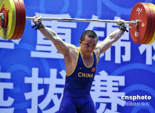 四月二十一日下午,二00八年全國(guó)男子舉重錦標(biāo)賽暨奧運(yùn)會(huì)選拔賽第八場(chǎng)比賽在僑鄉(xiāng)泉州體育館進(jìn)行,來自全國(guó)各代表隊(duì)的六十九公斤級(jí)選手展開了激烈角逐,雅典奧運(yùn)冠軍石智勇以一百六十一公斤的成績(jī)奪得抓舉冠軍。中新社發(fā) 傅丹丹 攝