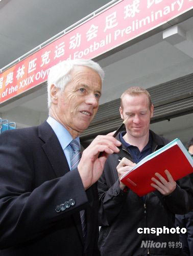 4月22日,國際足聯(lián)考察團(tuán)一行在北京奧組委官員的陪同下抵達(dá)上海,對08奧運(yùn)足球上海賽區(qū)籌備工作進(jìn)行考察。圖為國際足聯(lián)競賽部官員瓦特·西伯(左)和約翰·舒馬赫在上海考察奧運(yùn)足球賽場。中新社發(fā) 湯彥俊 攝