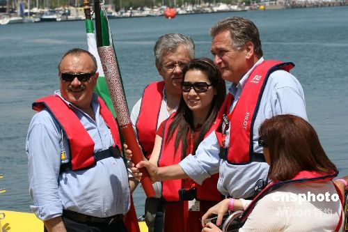 葡萄牙當?shù)貢r間5月4日下午,F(xiàn)1摩托艇世錦賽葡萄牙站比賽在葡萄牙波爾蒂芒舉行,北京2008奧運火炬手羅雪娟帶著她收藏的“祥云”奧運火炬來到F1賽場,在賽場會議上羅雪娟和國際摩聯(lián)F1委員會主席尼克魯共同呼吁:“崇尚體育精神、支持北京奧運”。在本次2008F1摩托艇世錦賽決賽前,羅雪娟和她收藏的“祥云”火炬被國際摩聯(lián)邀請到巡游艇上,進行賽前繞場一周巡游。這是奧運火炬首次出現(xiàn)在F1賽場。中新社發(fā) 北京泓鼎 攝