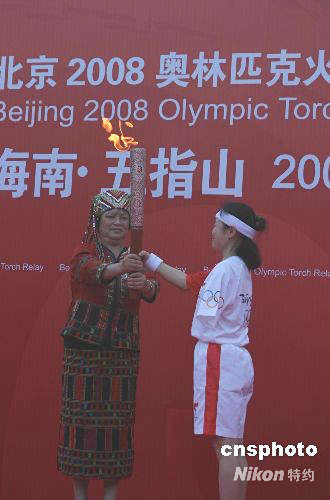 5月5日早上7時5分,北京奧運圣火在海南省腹地五指山市傳遞,五指山市是海南省黎、苗族聚居區(qū)域。圖為第一棒火炬手第十二屆殘奧會冠軍黎玉強(右)從海南省人大常委會副主任符桂花手中接過奧運火炬。中新社發(fā) 尹海明 攝