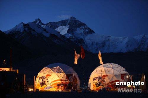 5月8日凌晨,北京奧運圣火登珠峰,珠峰大本營燈火通明。中新社發(fā) 盛佳鵬 攝