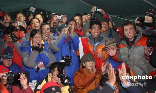 圖:圣火登頂 珠峰大本營(yíng)內(nèi)激動(dòng)的面孔
