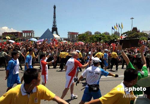 5月8日,奧運(yùn)圣火在深圳進(jìn)行傳遞。在深圳世界之窗門前芬蘭籍火炬手芬蘭前奧委會主任塔帕尼·愛爾卡與火炬手高正榮交接后向前傳遞圣火。中新社發(fā) 廖攀 攝