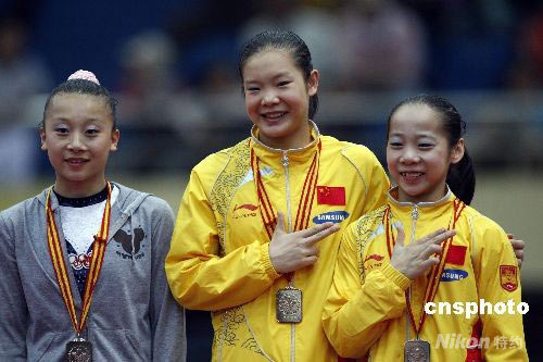 5月10日,2008全國(guó)體操錦標(biāo)賽暨奧運(yùn)選拔賽在天津體育中心進(jìn)入最后一個(gè)比賽日的爭(zhēng)奪,在女子跳馬決賽中,程菲(中)以15.812的高分輕松奪冠,山西選手鄧少婕(左)以15.45分奪得銀牌,安徽選手鄧琳琳獲得了銅牌,成績(jī)?yōu)?4.90。中新社發(fā) 杜洋 攝