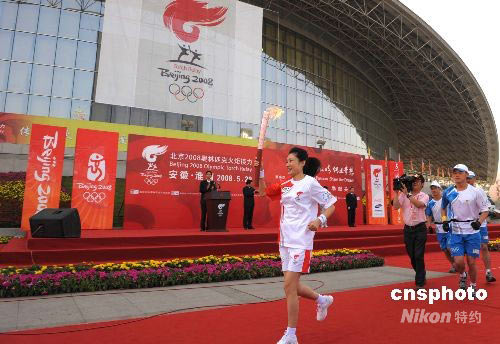 5月29日,奧運圣火在安徽淮南傳遞,中央電視臺主持人周濤領(lǐng)跑第一棒火炬。目前,周濤承擔(dān)北京奧運會和殘奧會全球電視轉(zhuǎn)播總協(xié)調(diào)工作。中新社發(fā) 廖攀 攝