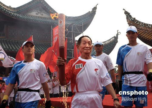 6月3日,奧運(yùn)圣火開始在湖南岳陽(yáng)傳遞,中國(guó)雜交水稻之父袁隆平在岳陽(yáng)樓前傳遞湖南第一棒火炬。 中新社發(fā) 廖攀 攝