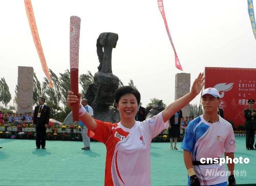 7月10日,奧運(yùn)火炬開始在著名的紅山文化起源地內(nèi)蒙古赤峰市進(jìn)行傳遞。傳遞線路全長6.1公里,起點(diǎn)為車伯爾民俗園。第一棒火炬手為赤峰第一任旅游局局長、全國旅游系統(tǒng)先進(jìn)個(gè)人娜日蘇。 中新社發(fā) 廖攀 攝