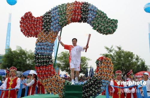 7月10日,奧運火炬在內蒙古赤峰市進行傳遞;鹁媸钟诮ㄔO穿過用福娃組成的“玉龍”。在赤峰翁牛特旗出土的紅山文化標志性文物——玉龍,被史學界定為“中華第一龍”。中新社發(fā) 廖攀 攝