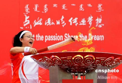7月10日,奧運(yùn)火炬在內(nèi)蒙古赤峰傳遞。赤峰末棒奧運(yùn)火炬手中國著名演員斯琴高娃在玉龍廣場點(diǎn)燃圣火盆,奧運(yùn)火炬在內(nèi)蒙古進(jìn)行的傳遞結(jié)束。 中新社發(fā) 廖攀 攝