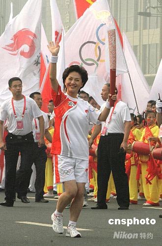 7月25日,奧運(yùn)火炬在河南鄭州傳遞,中央電視臺(tái)主持人海霞作為火炬手傳遞奧運(yùn)火炬。 中新社發(fā) 劉書亭 攝