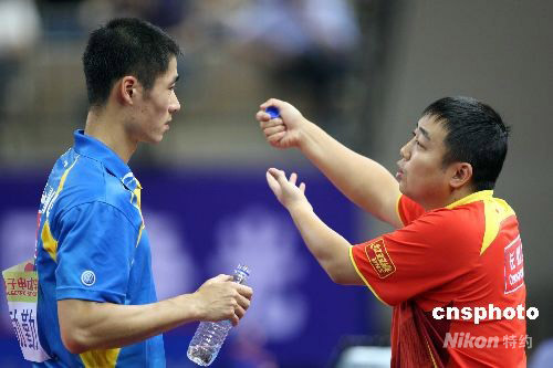 7月29日,中國乒乓球隊備戰(zhàn)奧運熱身賽在無錫繼續(xù)進行,男隊針對非奧運選手制定獎勵機制,在以王皓、馬琳、王勵勤3人為擂主的擂臺賽上,每名非奧運選手獲得一場勝利,就將獲得2009年一項國際公開賽的參賽權;獲得兩場勝利就能獲得2009年世乒賽單項比賽的參賽資格;獲得三場勝利則可以直接獲得2009年世乒賽男單比賽的參賽資格。擂主王勵勤在比賽中苦戰(zhàn)7局最終4比3完成大逆轉戰(zhàn)勝小將徐輝,主教練劉國梁賽中緊急指導。中新社發(fā) 盛佳鵬 攝