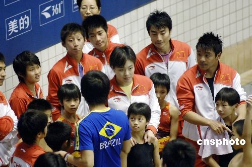 10月18日,奪得北京奧運(yùn)7金1銀3銅的中國(guó)跳水“夢(mèng)之隊(duì)”成員郭晶晶、吳敏霞、何沖等在福州給小跳水運(yùn)動(dòng)員傳授技藝。當(dāng)日,2008全國(guó)跳水錦標(biāo)賽在福建省體育中心游泳跳水館開(kāi)賽。中新社發(fā) 王東明 攝