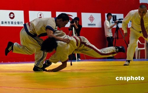十月二十七日,第六屆全國農(nóng)運(yùn)會“中國式摔跤”在泉州僑鄉(xiāng)體育館正式開賽。此次比賽共有來自全國各地十個級別的八十名運(yùn)動員參賽!爸袊剿印笔欠N類繁多的中國功夫當(dāng)中最具中國特色的,運(yùn)動員身穿短上衣、系腰帶、穿長褲,可以抱腿、絆腳、扯肩、扭腰等動作,只要把對方摔倒在地就能得分。中新社發(fā) 傅丹丹 攝