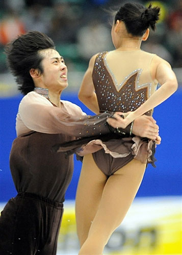 中國(guó)選手張悅/王磊(左)以51.02暫列雙人滑第四位。