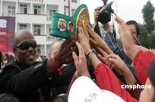 圖為WBC將金腰帶送給了學(xué)校,孩子們爭相伸手撫摸金腰帶,希望能從中吸取勇敢的力量。