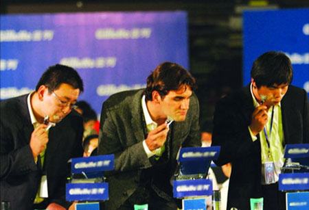 一通大山侃完,費(fèi)德勒開始跟大學(xué)生代表近距離互動(dòng),這次他送出的禮物是自己當(dāng)場(chǎng)簽名的《費(fèi)德勒自傳》。最后的剃須環(huán)節(jié)則與去年完全一致,費(fèi)德勒一手拿著麥克風(fēng)一手拿著剃須刀“言傳身教”,告訴學(xué)生們哪些是正確的剃須方式,哪些是不該養(yǎng)成的壞習(xí)慣。臺(tái)下千余人集體效而法之,人人下巴上沾滿白色潔面膏的場(chǎng)面猛一看去,倒也蔚為壯觀。特派記者 劉皓