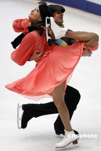 11月7日,2008中國(guó)杯世界花樣滑冰大獎(jiǎng)賽在北京首都體育館進(jìn)行第二天的爭(zhēng)奪,俄羅斯組合多姆尼娜、沙巴林在冰舞創(chuàng)編舞比賽后,以95.58的成績(jī)繼續(xù)排在參賽的十對(duì)選手之首。中新社發(fā) 盛佳鵬 攝