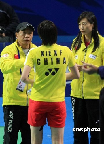 11月19日,在上海舉行的2008年中國羽毛球公開賽展開正賽首輪爭奪,中國羽壇老將、北京奧運會女單冠軍張寧(圖右),上任國家隊女單教練后首次亮相賽場督戰(zhàn),格外引人關注。中新社發(fā) 湯彥俊 攝