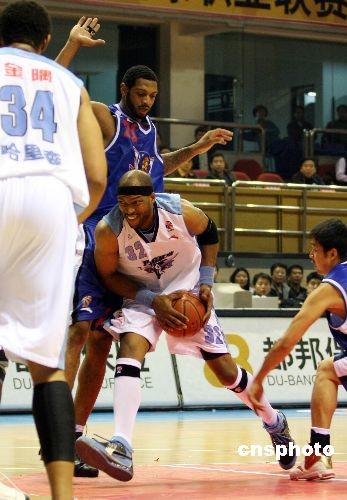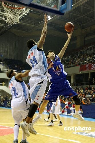 11月23日,在2008—2009賽季CBA聯(lián)賽第四輪比賽中,北京金隅隊主場戰(zhàn)勝天津榮鋼隊,獲得聯(lián)賽開始后的首場勝利。三連敗后的北京金隅回到主場迎接天津榮鋼的挑戰(zhàn)。開場后天津隊雙外援發(fā)揮出色,比分領(lǐng)先,但北京金隅很快適應(yīng)了天津隊的打法,加強(qiáng)防守限制了對方外援在內(nèi)線的發(fā)揮,在第四節(jié)逐漸將分差拉大,逐步奠定了勝勢,最終將比分定格在98比84。中新社發(fā) 王韶驊 攝